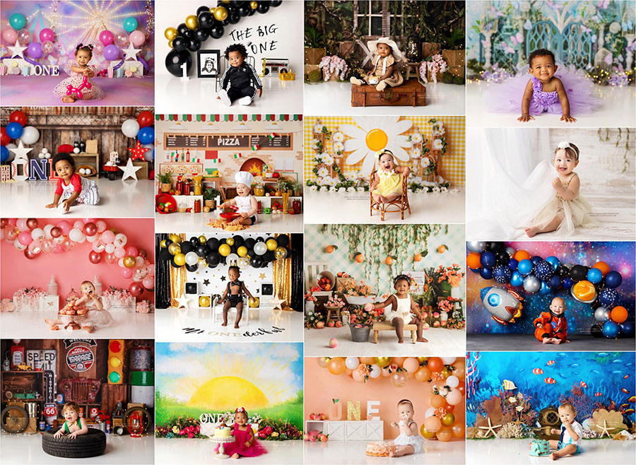 • cake smash set for baby only: 1 backdrop from the studio collection, a custom backdrop (if booked in advance), or a balloon garland set